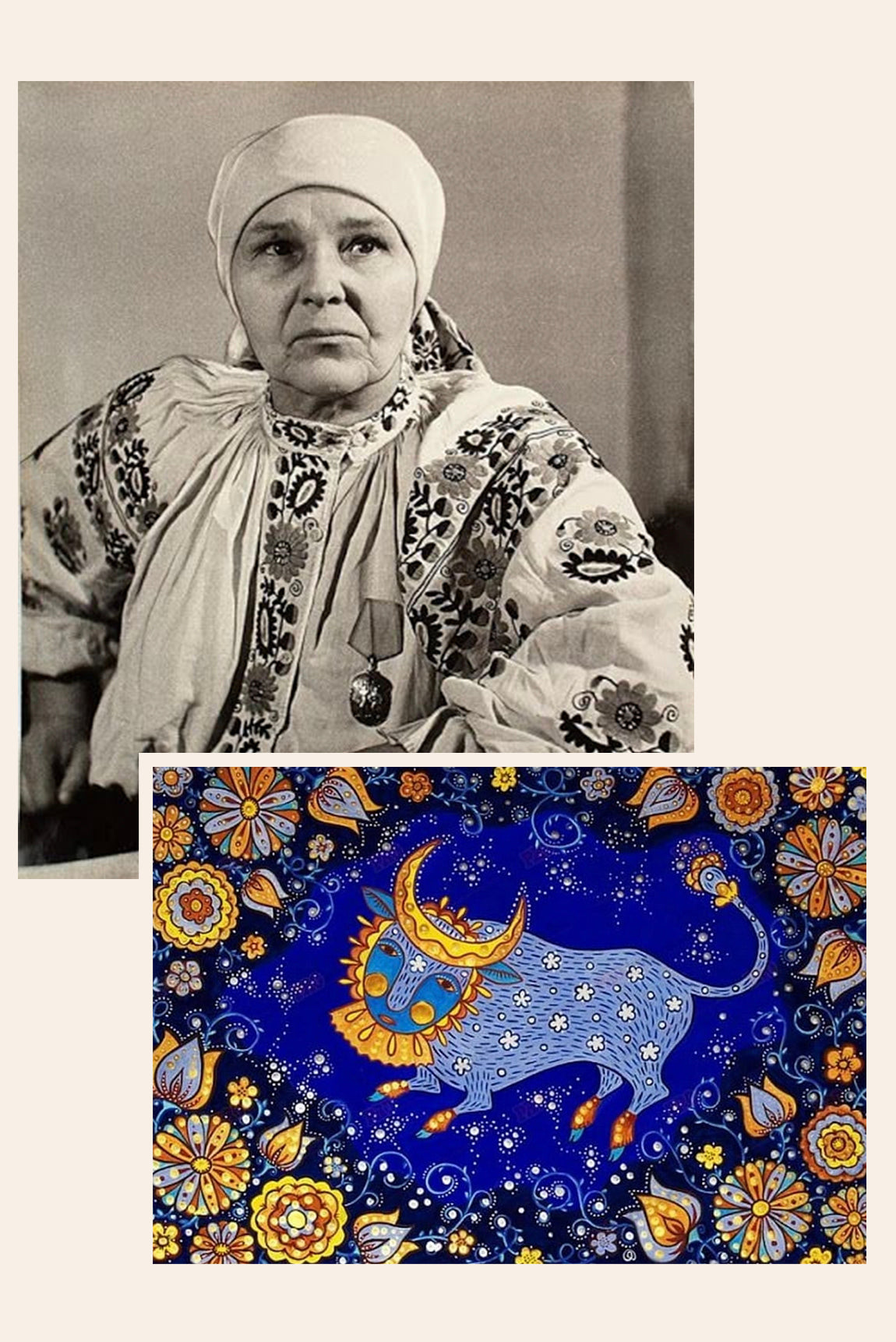 Maria Prymachenko was a self-taught folk painter, known for her work in primitivism and the naïve art style. Her work often featured scenes from traditional Ukrainian village life, flowers and animals, bold colors and psychedelic patterns. Prymachenko’s work was even admired by Pablo Picasso, who called her an artistic miracle.