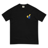 This T-shirt shows an illustration of a traditional ceramic rooster (pivnyk in Ukrainian). This rooster has become a symbol of Ukraine’s survival in the face of Russia’s invasion after it appeared in a photo from Borodianka, Kyiv Oblast, in April 2022.