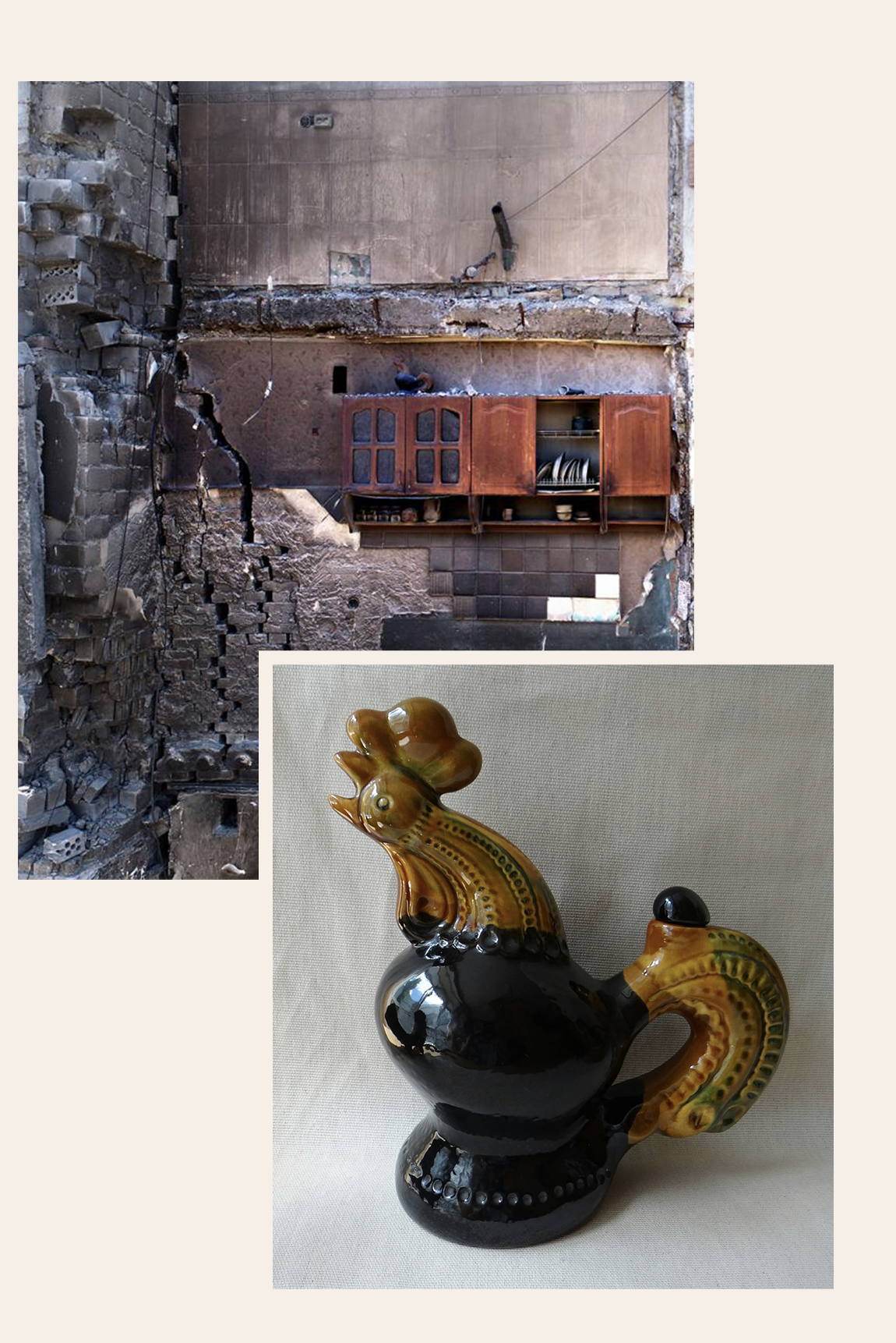 The photo showed a ruined apartment building, where an entire room had been ripped away in a Russian strike. Just one wall with a kitchen cabinet remained intact. On top of that cabinet a ceramic rooster was still standing. The rooster is thought to have first been produced sometime around 1960 in a pottery factory in the nearby town of Vasylkiv.