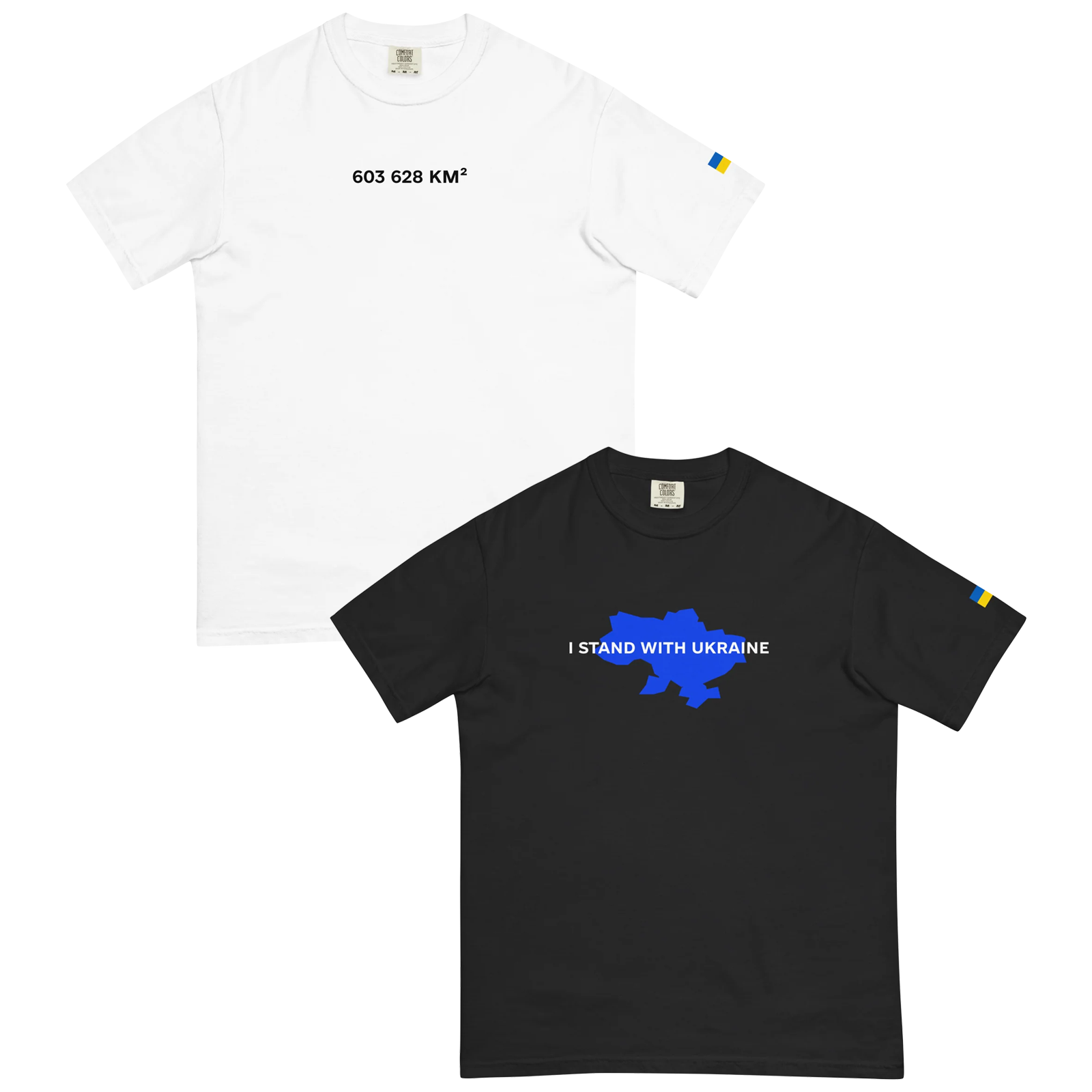 Our Support Bundle makes it simple to show where you stand. Our “I Stand with Ukraine” T-shirt offers a visual declaration of your solidarity, while the “603,628 km²” T-shirt represents the size of Ukraine’s territory, despite Russia's claims to Ukrainian land.